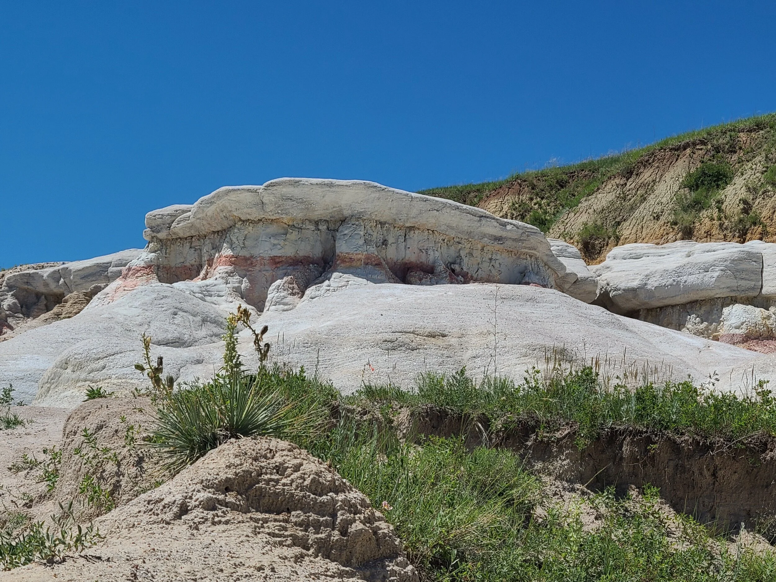 Erosion of the Badlands reveals sedimentary layers of different colors: purple and yellow (shale), tan and gray (sand and gravel), red and orange (iron oxides) and white (volcanic ash).